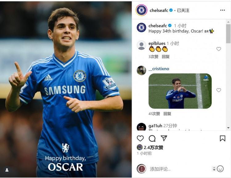 切尔西官方社媒晒出奥斯卡效力球队时期的照片,配文:“祝奥斯卡34岁生日快乐!”